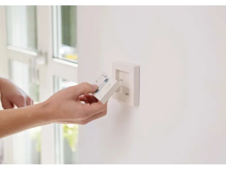 Dank der praktischen Wandhalterung kann die Zeitschaltuhr zu einem unauffälligen Wandschalter umfunktioniert werden. Diese kann an einer beliebigen Stelle montiert werden, aufgrund des Batteriebetriebs und einer Reichweite von 20 m im Gebäude. Die Zeitschaltuhr kann durch einfaches Kippen jederzeit aus der Halterung herausgenommen werden und ähnlich einer Fernbedienung verwendet werden. Die Bedienung und Einstellung wird erleichtert durch drei große Tasten für Auf-, Abfahrt und Stopp sowie durch einen Schiebeschalter für das Umschalten zwischen Zeitautomatik und manuellem Betrieb.
