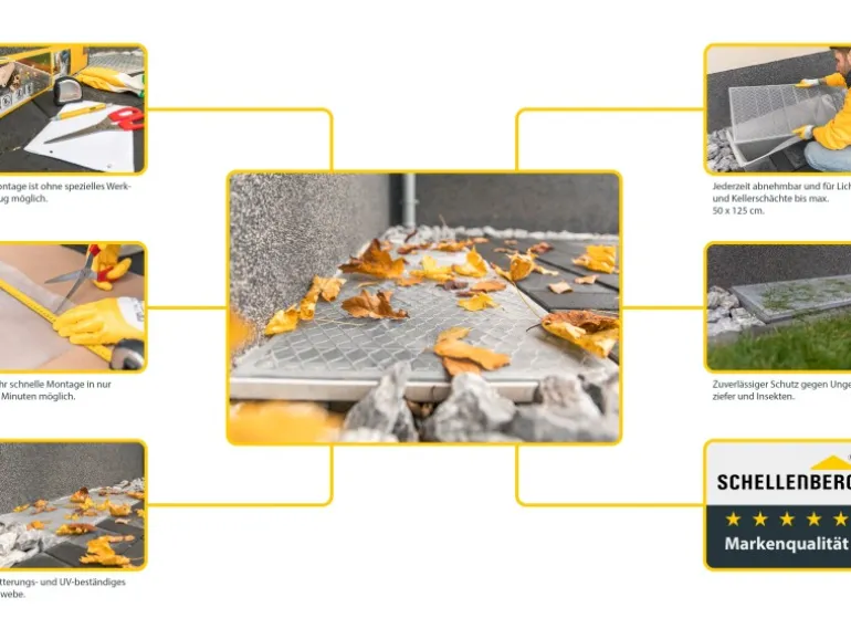 Die Montage des Lichtschachts-Abdeckung erfolgt ganz ohne Rahmen – er wird einfach auf das vorhandene Gitter des Licht- oder Kellerschachts mit maximalen Abmessungen von 50 cm x 125 cm gespannt. Die Abdeckung kann individuell gekürzt werden und ist jederzeit abnehmbar, wobei das benötigte Befestigungsmaterial bereits im Lieferumfang enthalten ist.