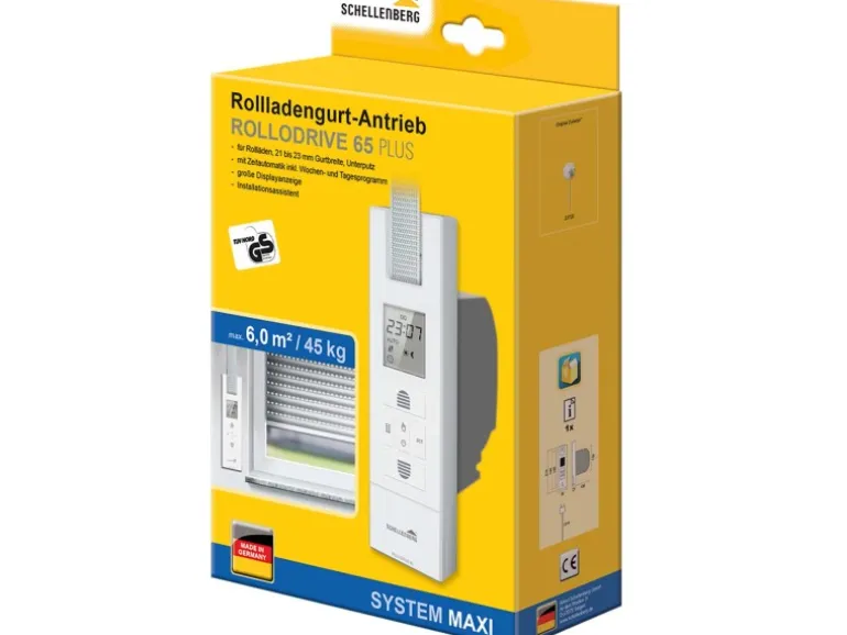 Der Schellenberg RolloDrive 65 Plus ermöglicht die Bedienung eines Rollladens bequem per Knopfdruck, Zeitautomatik oder optional per Lichtwert. Er ist für Kunststoff-Rollläden bis zu einer Fläche von 6 m² geeignet und kompatibel mit dem Rollladensystem Maxi mit einer Gurtbreite von 23 mm. Er ersetzt einen vorhandenen mechanischen Einlasswickler vollständig und wird Unterputz montiert. Der Mauerkasten sollte eine Mindesthöhe von 134 mm haben. Der RolloDrive 65 Plus eignet sich ideal für Mietobjekte, da für den Einbau das Öffnen des Rollladenkastens nicht zwingend notwendig ist.