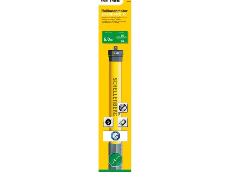 Der laufruhige Rohrmotor Standard zeichnet sich durch eine starke, verschleißarme Bremse sowie einen wartungsfreien Motor mit einer hochwertigen Getriebeeinheit mit Sinterzahnrädern aus. Ein extrabreiter Mitnehmer kompensiert eine ungerade zugeschnittene Rollladenwelle und die Sondergröße des Adapters sorgt für eine optimale Kraftübertragung auf die Rollladenwelle. Durch einen thermischen Überlastungsschutz schaltet sich der Motor bei Überhitzung ab und schont so den Motor. Für die Steuerung des Rohrmotors Standard wird ein separat erhältliches Steuerelement benötigt. Hierfür eignen sich die Schellenberg Rollladenschalter oder die Schellenberg Zeitschaltuhren. Die Steuerung mehrerer Rollladenmotoren lässt sich durch die Verwendung eines Relais realisieren. Für den Einbau in den Rollladenkasten liegt ein höhenverstellbares Wandlager dem Lieferumfang bei. Die Stromversorgung erfolgt über ein vieradriges Anschlusskabel mit 2 m Länge.