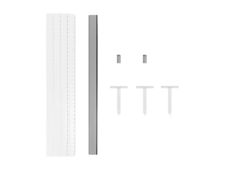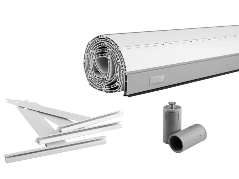 Dieses Set besteht aus einem grauen Rollladenpanzer aus PVC, Aufhängefedern, einer Endleiste aus Aluminium sowie passenden Rollladenstoppern.