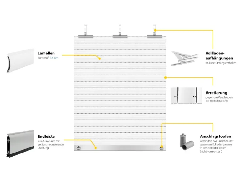 Die PVC-Lamellen des Rollladenpanzers sind leicht witterungsbeständig und haben ein stabiles Mehrkammer-System. Sie entsprechen dem Schellenberg Rollladensystem Mini, haben eine Deckhöhe von 52 mm und eine Tiefe von 14 mm. Die im Set enthaltene Abschlussleiste verfügt über einen integrierten Gummikeder, der für ein geräuscharmes Aufsetzen des Rollladens und zur Verhinderung von Festfrieren oder Beschädigungen an der Fensterbank sorgt.