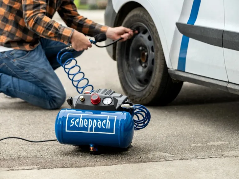 Der Scheppach Kompressor HC06 6 L Inkl. Zubehörset überzeugt mit seinem Tragegriff und einem geringen Gewicht von nur 8,2 kg, was einen einfachen Transport und mobilen Einsatz ermöglicht. Die Schnellkupplung sorgt für einen schnellen und unkomplizierten Werkzeugwechsel. Dank des mitgelieferten Zubehörs ist der HC06 für zahlreiche Anwendungen bestens gerüstet.
