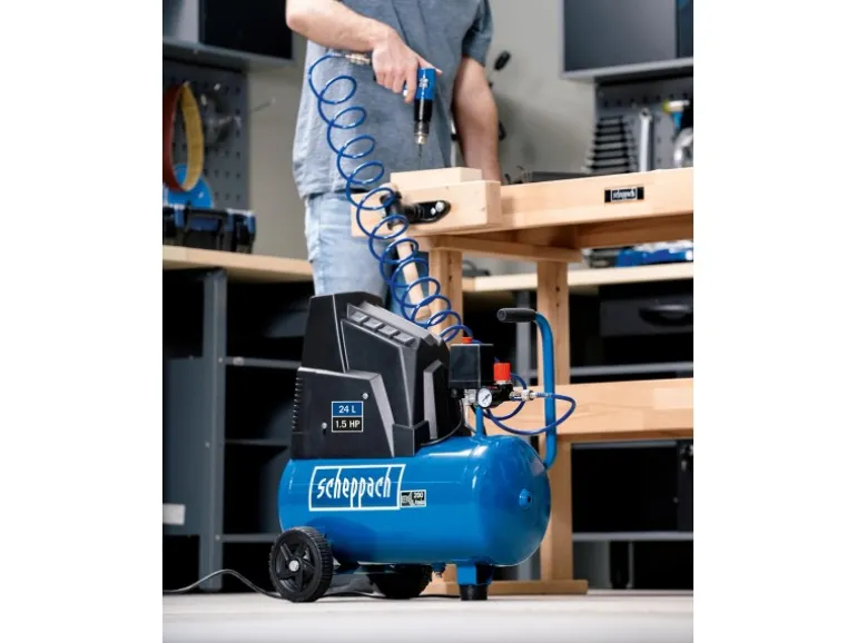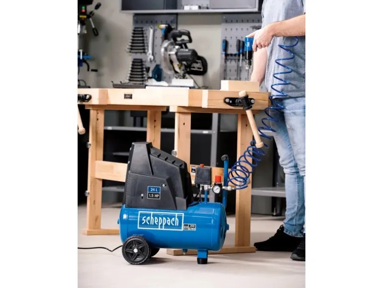 Mit einem Kesselvolumen von 24 l, einer maximalen Ansaugleistung von 200 l/min und einem Arbeitsdruck von 8 bar ist der HC30ox von Scheppach ideal für den Heimgebrauch und die Hobbywerkstatt geeignet. Der vibrationsgedämpfte Standfuß aus Gummi ermöglicht ein sicheres, rutschfestes Abstellen und ein besonders ruhiges Arbeiten.
