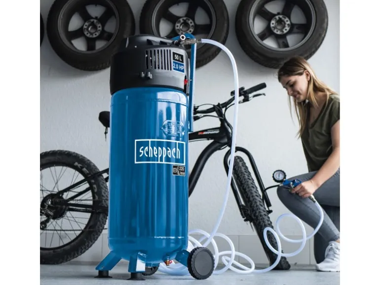 Dank seiner durchdachten Konstruktion lässt sich der Kompressor platzsparend lagern. Die integrierte Fahrvorrichtung und der praktische Handgriff sorgen für komfortablen Transport und höchste Mobilität.