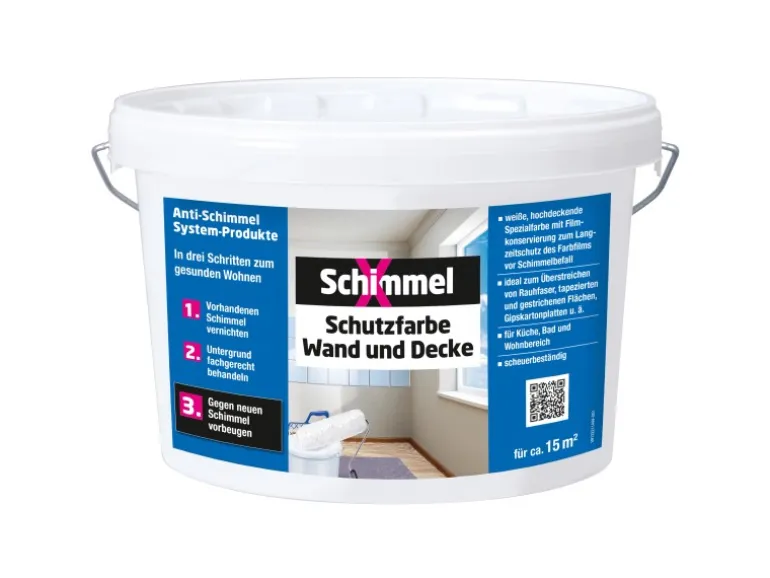 Die SchimmelX Schutzfarbe für Wand und Decke ist eine weiße, hochdeckende Spezialfarbe mit Filmkonservierung zum Langzeitschutz des Farbfilms vor Schimmelbefall. Die Schutzfarbe ist anwendbar auf überstreichbaren Tapeten und Rauhfaser, vorhandenen Dispersionsfarbenanstrichen, Styropor-Deckenplatten, Gipskartonplatten, Putz, Beton, Stein und ähnlichen Untergründen.