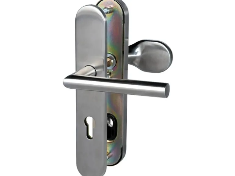 Sicherheitsbeschlag „Sicura Ronny-LS“ in Edelstahl Satiniert für Wohnungseingangstüren. Der Sicherheitsbeschlag ist mit einer stabilen Unterkonstruktion ausgestattet. Die Garnitur verfügt über eine Rückholfeder und garantiert somit einen dauerhaft waagrechten Sitz des Drückers. Die Garnitur ist mit einer 88 mm Profilzylinder Lochung versehen und passend für alle Türen mit einer Türstärke von 37 mm – 42 mm.
