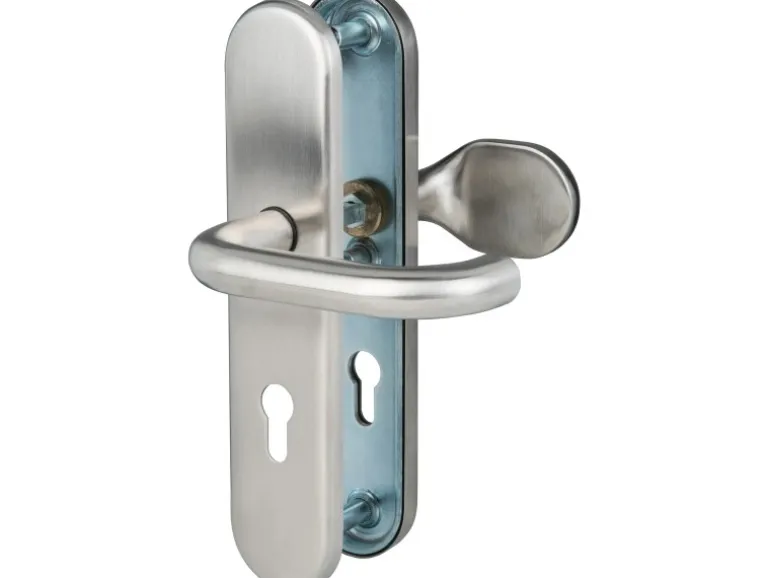 Sicherheitsbeschlag „Toronto-LS“ in Edelstahl Satiniert für Wohnungseingangstüren. Der Sicherheitsbeschlag ist mit einer stabilen Unterkonstruktion ausgestattet. Die Garnitur verfügt über eine Rückholfeder und garantiert somit einen dauerhaft waagrechten Sitz des Drückers. Die Garnitur ist mit einer 72 mm Profilzylinder Lochung versehen und passend für Türen mit einer Türstärke von 37 – 42 mm.