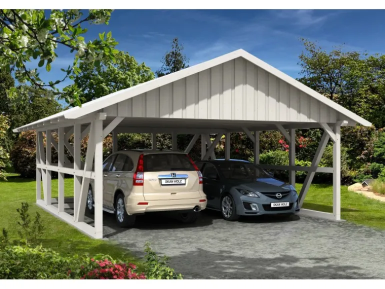 Ablagespuren bei farblich allseitig behandelten Bauteilen sind technisch bedingt. Das Dach wird mit 20 mm starker Dachschalung zur Eindeckung mit Dachschindeln geliefert (Dachschindeln sind als Zubehör optional bestellbar). Zur Verankerung mit der Bodenschwelle mit dem Untergrund sind Dübel im Bausatz enthalten.