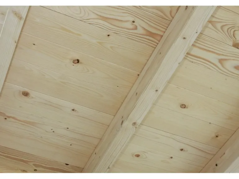 Ablagespuren bei farblich allseitig behandelten Bauteilen sind technisch bedingt. Das Dach wird mit 20 mm starker Dachschalung zur Eindeckung mit Dachschindeln geliefert (Dachschindeln sind als Zubehör optional bestellbar). Zur Verankerung mit der Bodenschwelle mit dem Untergrund sind Dübel im Bausatz enthalten.