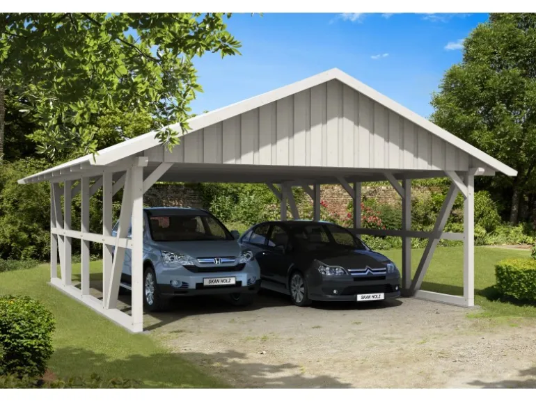 Ablagespuren bei farblich allseitig behandelten Bauteilen sind technisch bedingt. Das Dach wird mit 20 mm starker Dachschalung zur Eindeckung mit Dachschindeln geliefert (Dachschindeln sind als Zubehör optional bestellbar). Zur Verankerung mit der Bodenschwelle mit dem Untergrund sind Dübel im Bausatz enthalten.