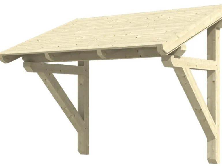Die Konstruktion des Vordaches ist aus Konstruktionsvollholz (KVH) gefertigt. Als KVH bezeichnet man technisch getrocknetes, endlos verleimtes, massives Fichtenholz. Die einzelnen Holzteile werden getrocknet, nach Fehlern gescannt, sortiert und anschließend wetterfest durch Keilzinken miteinander endlos verleimt. Risse, Äste und leichte Verdrehungen spiegeln den Charakter der eingesetzten Materialien wider.