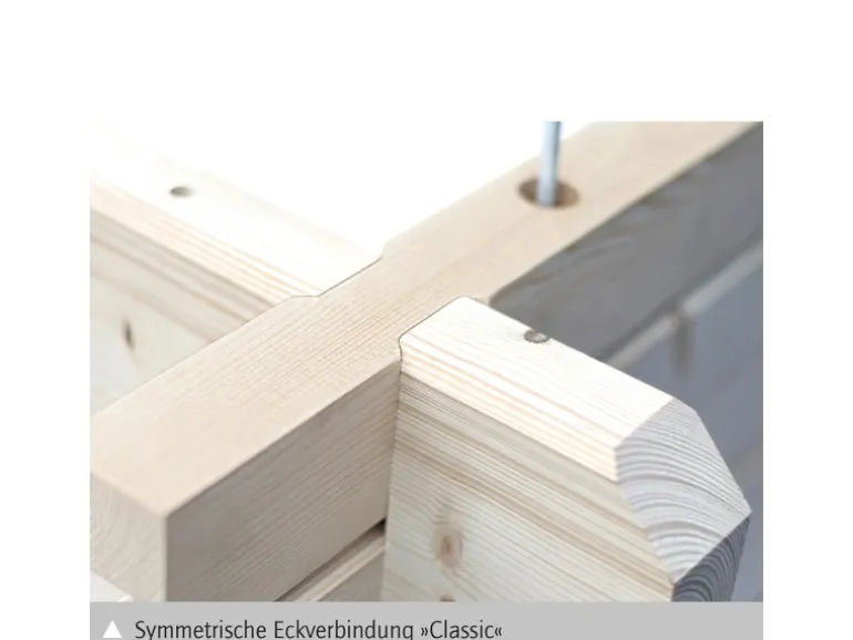 Eine massive Wandstärke von 28 mm macht die Konstruktion des Holzgartenhauses sehr stabil. Die Unterkonstruktion besteht aus imprägnierten Grundlagern, auf denen der Fußboden aus Nut- und Federbrettern verlegt wird. Die praktische Blockbohlenbauweise sorgt für einen einfachen Aufbau.