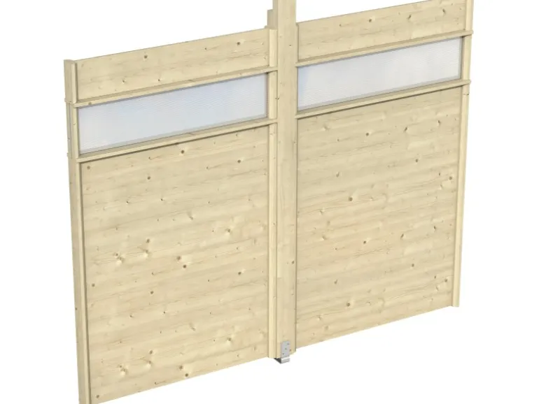 Die Skan Holz Seitenwand mit Lichtband für den Pavillon Toulouse besteht aus 2 cm starken Profilschalungsbrettern mit Nut und Feder aus unbehandeltem Konstruktionsvollholz sowie einem Lichtband aus einer 10 mm Polycarbonat-Doppelstegplatte in klar. Das Lichtband sorgt für leichten Lichteinfall. Die Höhe beträgt 207 cm, die Seitenwand schließt mit der Dachkante des Pavillons ab, so dass die Seite vollständig geschlossen ist. Einbaupfosten 12 cm x 12 cm inklusive Aufschraubstütze zum Aufdübeln auf das bauseits erstellte Fundament. Lieferung inklusive Montagematerial und Aufbauanleitung.