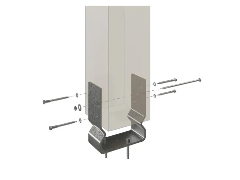 Die Aufschraubstützen aus verzinktem Flachstahl inklusive Dübel zum Befestigen auf das bauseitig erstellte Fundament sind im Bausatz enthalten. Sie gewähren eine sichere Verbindung zum Untergrund.