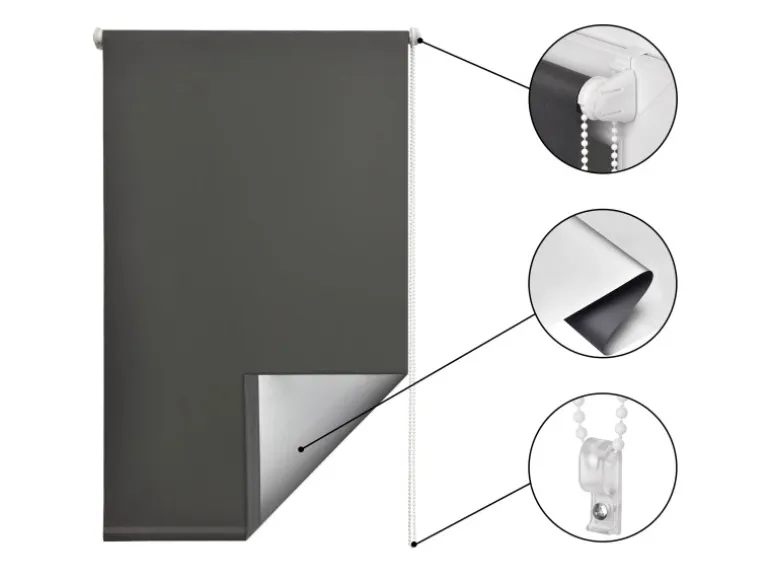 Mit den praktischen und leicht anzubringenden Rollos schaffen Sie blitzschnell und ohne Bohren eine behagliche Wohnatmosphäre in Ihren Räumen. Sol Royal SolReflect T42 Thermorollo VerdunkelungsrolloMit den praktischen und leicht anzubringenden Rollos schaffen Sie blitzschnell und ohne Bohren eine behagliche Wohnatmosphäre in Ihren Räumen.Montage mit oder ohne BohrenDas Sol Royal Thermorollo SolReflect T42 kann mit Bohren, aber auch mittels Klemmfix ohne Bohren an Ihrem Fenster, Ihrer Balkontür oder Terrassentür angebracht werden. Es ist lichtundurchlässig und ideal als Blickschutz, Sonnenschutzrollo oder als Hitzeschutz Rollo für Fenster und Tür.Thermobeschichtung:Das Verdunkelungsrollo hat eine isolierende Thermobeschichtung in Silber und ist zu 100% verdunkelnd. Im Winter blockt das Rollo die kalte Luft von draußen und spart so Heizkosten. Im Sommer wird der Raum durch die Thermobeschichtung abgekühlt.KlemmfixDas Thermorollo lässt sich auch ohne Bohren mittels der im Lieferumfang enthaltenen Klemmträger einfach und schnell anbringen. Sie möchten es lieber an die Wand oder Decke bohren? Das ist durch das mitgelieferte Material ebenfalls kein Problem.Die in der Beschreibung angegebenen Maße entsprechen der Gesamtbreite des Rollos. Die Stoffbreite ist ca. 4 cm schmaler.Mit den praktischen und leicht anzubringenden Rollos, schaffen Sie blitzschnell und ohne Bohren eine behagliche Wohnatmosphäre in Ihren Räumen.Produktdetails:Material: 100% Polyester Geeignet für Falzstärken bis 16 mm Verdunkelungsrollo mit Thermobeschichtung – isolierend und zu 100% verdunkelnd Klemmfix – einfache und schnelle Montage mit Klemmträgern, ganz ohne Bohren und Schrauben Sonnenlicht-Reflexion im Sommer – Abkühlung der Wohnräume Abwischbarer, UV- und feuchtigkeitsbeständiger Stoff Kettenzugmontage links und rechts möglich Kettenzug mit Kindersicherung Bedienung über EndlosketteWarnhinweis:Bitte beachten Sie, dass Kinder sich mit Schnüren und Ketten strangulieren können. Bitte installieren Sie daher das Rollo nicht in der Nähe von Kinderbetten und achten Sie stets auf die Sicherheit Ihres Kindes.