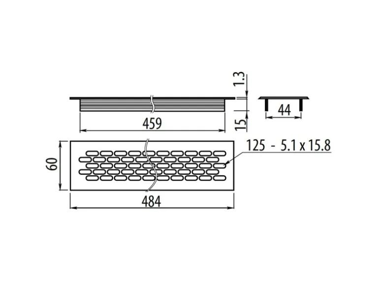 Länge 484mm / Höhe 60mm / Einbaumaß 459x44mm / MONTAGE Das Lüftungsgitter wird geklemmt/geklebt