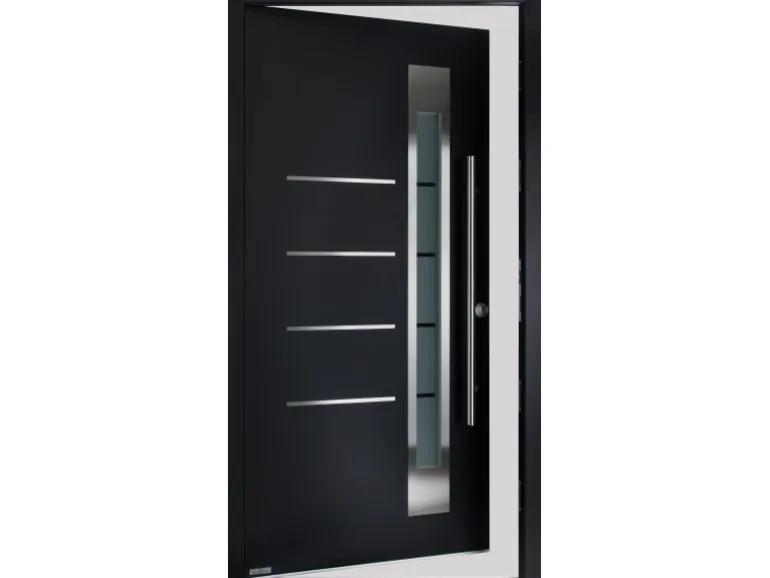 Die Hauseingangstür bietet optimale Wärmedämmung. Alle Bauelemente tragen dazu bei: Das Stahltürblatt mit einer Bautiefe von 67 mm ist mit PU-Hartschaum gefüllt und verfügt über zwei Dichtungsebenen. Die Türzarge und die Bodenschwelle aus thermisch getrenntem Aluminium verbessern die Wärmedämmung zusätzlich. Der Wärmedämmwert Ud beträgt 0,79 W/m² K. Die dreifache ISO-Verglasung reduziert den Wärmeverlust mit einem Ug-Wert von 0,9 W/m² K und lässt natürliches Licht effizient durch.