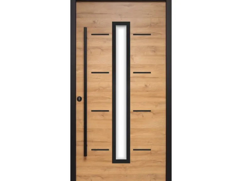 Darüber hinaus dient das Glaselement aus satinierter 3-fach ISO-Verglasung nicht nur der schönen Optik, sondern reduziert ebenfalls Ihre Heizkosten und dient als natürliche Lichtquelle für Ihren Flur. Dank dieser Maßnahmen besitzt die Haustür einen hervorragenden Wärmedämmwert (Ud-Wert) von 0,79 W/m²K, was diese besonders für Niedrigenergiehäuser geeignet macht.