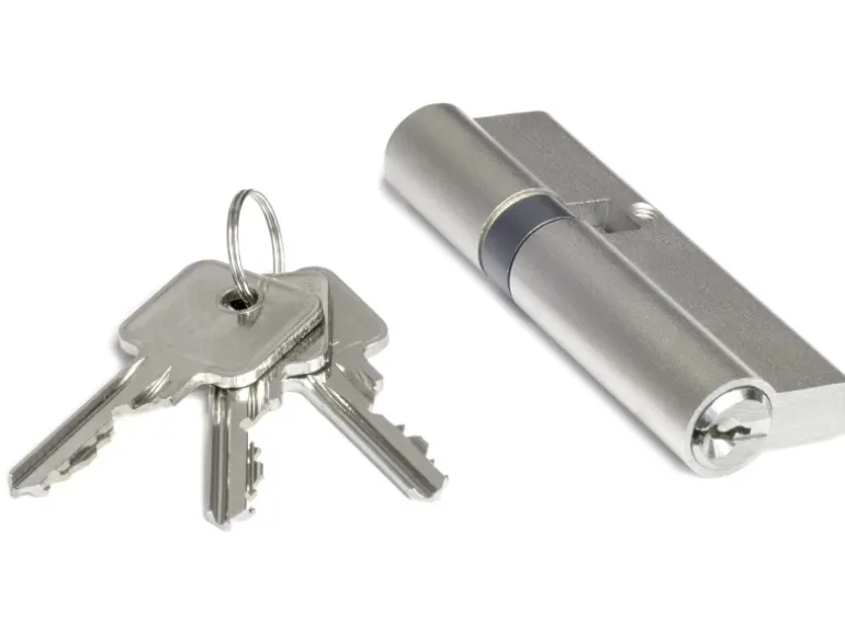 Die Tür ist über drei stabile Bänder mit der Zarge verbunden, die Sie bei Bedarf dreidimensional verstellen können. Für ein zusätzliches Hindernis sorgen sechs Aushebelbolzen direkt an der Bandseite. Das Schloss ist mit einem Profilzylinder mit drei Schlüsseln und einer Edelstahl-Rosette ausgestattet.