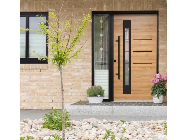 Die Splendoor Haustür Thermospace Berlin Prime RC2 Woodeffect Woodeffect vereint ein ansprechendes, modernes Design mit einer hochwertigen Verarbeitung in all ihren Bauelementen. Die Türoberfläche ist mit einer Eiche-natur-Dekorfolie vor Witterung geschützt. Ihre gleichmäßige Färbung setzt in Kombination mit den schwarzen Blendrahmen, der Glasapplikation und der schwarzen Stoßgriff-/Drückergarnitur gezielte Kontraste für ein hochwertiges Aussehen. Die tief eingelegte Applikationen mit dem Türblatt flächenbündig machen diese noch hochwertiger und dazu auch pflegeleichter.