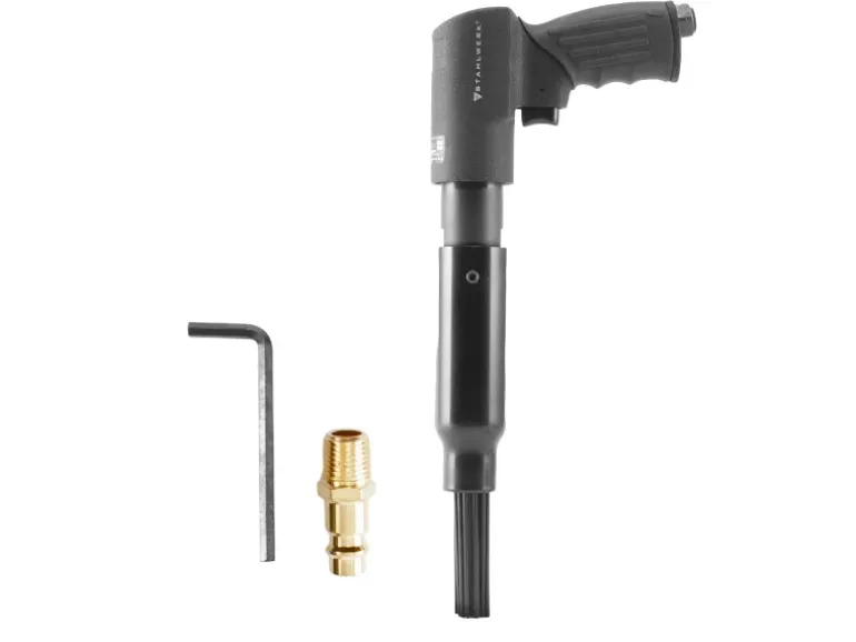 – Praktischer, stabiler und universell einsetzbarer Druckluft-Nadelentroster mit 14 mm Trommelhub zum professionellen Entfernen von Rost, Farben, Lackrückständen sowie zum Abschlagen und Entfernen von Schweißschlacke.