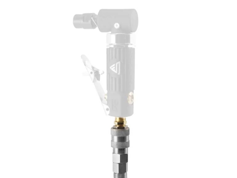 Schnellkupplung zum Anschluss von Druckluftwerkzeugen, messingvernickelte Verschraubungen.