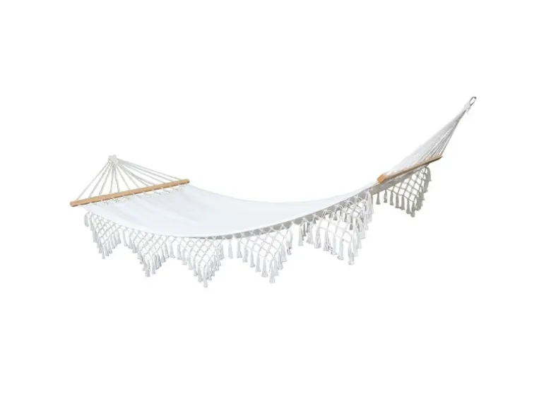 Mit den Macramé-Verzierungen im Boho-Stil schmückt die Hängematte jeden Garten und lädt zum Verweilen ein. Die Holzstabilisierungen an den Enden bieten zusätzliche Sicherheit beim Liegen in der Hängematte.