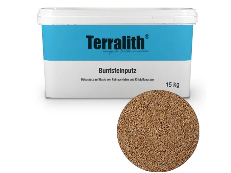 Terralith-Buntsteinputz ist ein verarbeitungsfertiger Dekorationsputz aus Marmor-Granulat bzw./ oder eingefärbter Körnung mit einem Reinacrylat als Bindemittel. Terralith-Buntsteinputz ist diffusionsfähig und langlebig. Er ist im Innen- und Außenbereich anwendbar.Wir empfehlen grundsätzlich die Bestellung eines Farbmusters, da der Farbton auf Monitoren stark abweichen kann. Das Farbmuster besteht aus Originalmaterial aus der in diesem Moment im Verkauf befindlichen Charge. Unsere Buntsteinputze bestehen zum großen Teil oder auch ganz aus Natursteinen, deswegen sind Farbunterschiede und Unterschiede im Körnungsaufbau möglich. Farbe und Körnungsaufbau können immer nur für eine Lieferung garantiert werden.Eigenschaftengestalterische Vielseitigkeit mit rund 200 verschiedenen Variationen hoch mechanisch belastbar ideal für strapazierte Bereiche wie Sockel oder Eingangsbereiche gute Wasserdampfdurchlässigkeit schmutzunempfindlich witterungsbeständigAnwendungsgebieteWandflächen im Innen- und Außenbereich mineralische Untergründe Wärmedämmverbundsysteme Sockelbereiche, Wandflächen in Treppenhäusern, Fluren, Garagen etc. kein Bodenbelag / nur für vertikale FlächenGrundierung