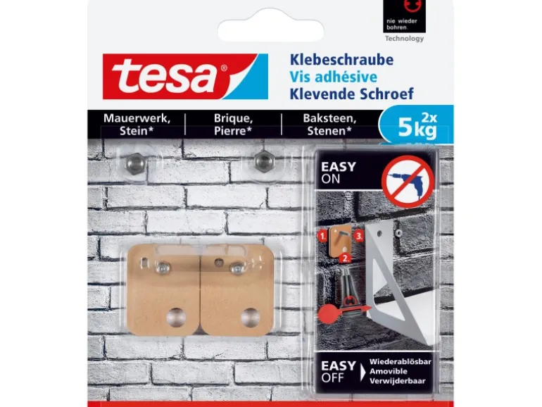 Dank der überlegenen Tesa Klebequalität können Sie mit der rechteckigen Klebeschraube Gegenstände bis zu einem Gewicht von 5 kg pro Schraube im Innen- und Außenbereich sicher anbringen. Geeignete Untergründe für die rechteckige Klebeschraube: Beton, Stein, Holz, Fliesen, Kunststoffe, Glas und Metall.