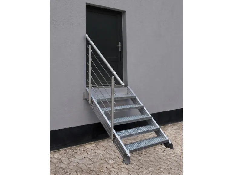 Mit ihrer modernen Bauweise ist die Außentreppe Alaska 3 besonders gut für den Einsatz im Außenbereich geeignet, ob für Balkone, Terrassen oder den Zugang zu höher gelegenen Bereichen. Sie bietet eine langlebige und sichere Lösung, die sowohl funktional als auch optisch ansprechend ist.