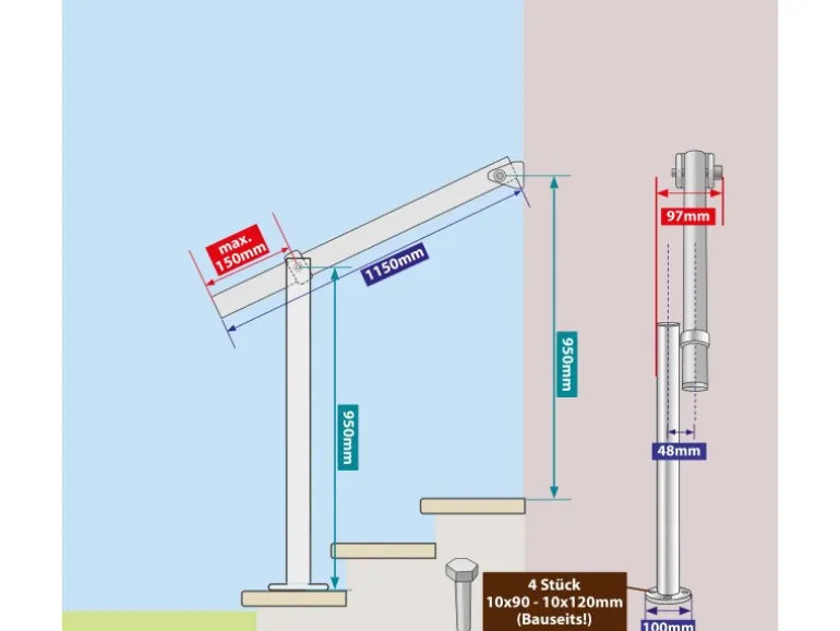 Der Wandbügel aus Edelstahl V2A sorgt für die sichere Befestigung an der Wand.Mit diesen durchdachten Komponenten erhalten Sie ein qualitativ hochwertiges und stilvolles Eingangsgeländer, das nicht nur praktisch ist, sondern auch durch seine Optik überzeugt.