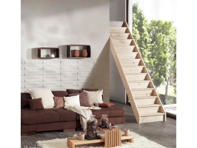 Die Montage der Holztreppe kann an der Wand oder auch freistehend im Raum erfolgen