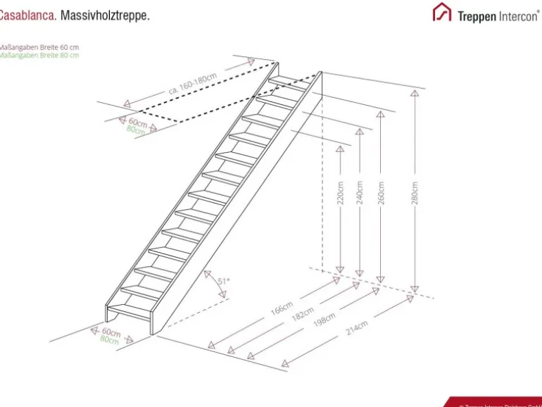 Diese Massivholztreppe gibt es wahlweise in den Treppenbreiten 60 cm und 80 cm sowie mit oder ohne Setzstufen. Im Ergebnis zeichnet sich die Holztreppe Casablanca durch ihre Vielfältigkeit aus.Massivholztreppe CasablancaKlassisch-moderne Holztreppe aus massiver Buche in sauberer Verarbeitung mit 13 Stufen bzw. 14 Steigungen