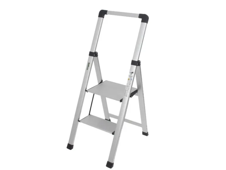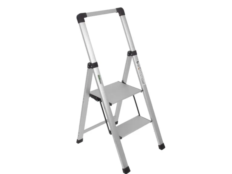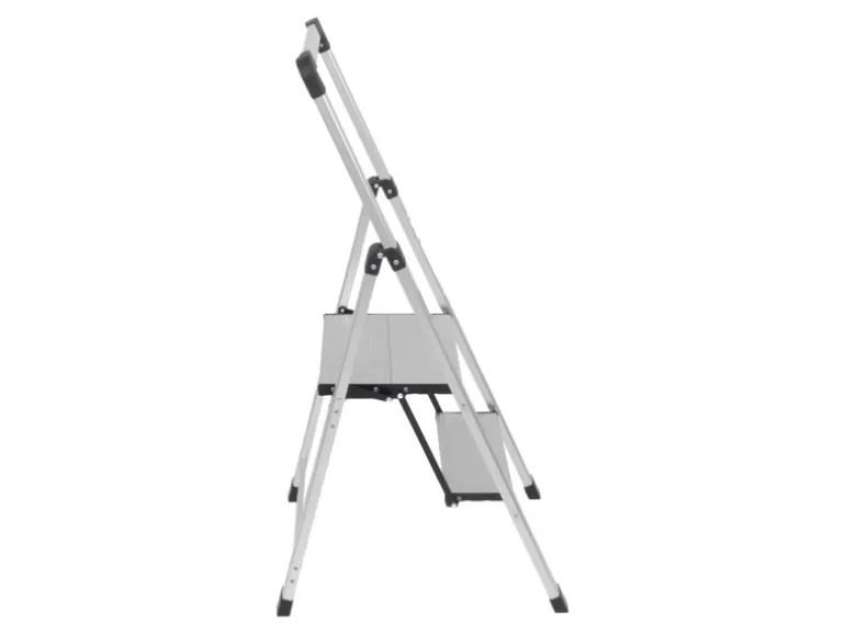 Der zweistufige Alu-Tritt ist TÜV/GS zertifiziert und bietet eine geprüfte Tragfähigkeit von bis 150 kg. Ein weiteres Element für die sichere Anwendung ist eine integrierte Sicherheitsverriegelung, die ein ungewolltes Zusammenklappen der Leiter verhindert. Zusätzlich unterstützen rutschfest profilierte Trittstufen ein sicheres Besteigen des Klapptritts, während gummierte Standfüße das Rutschen auf glatten Böden verhindern. Die Gummierung schützt gleichzeitig empfindliche Böden vor Kratzern. Nach Gebrauch lässt sich der Klapptritt im Handumdrehen zusammenfalten und mit nur ca. 5 cm Breite ist er so platzsparend, dass er hinter Türen, unter Möbel oder in schmale Nischen passt.
