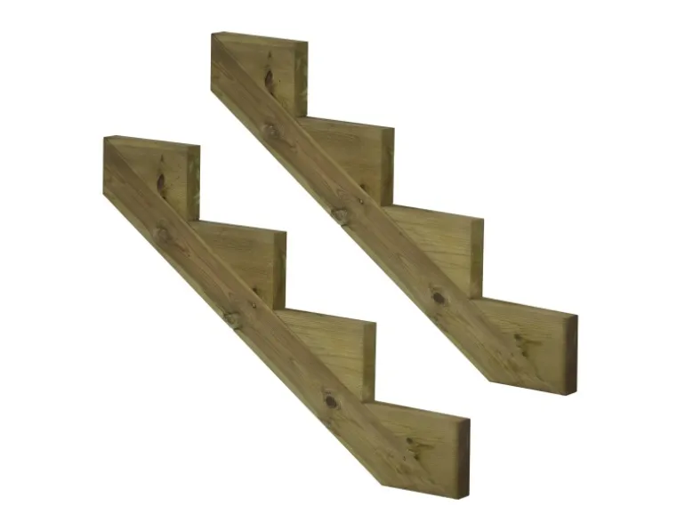 Dann verwenden Sie unsere praktischen Treppenwangen aus imprägniertem Holz (KDI)! Unsere Treppenwangen sind mit 2, 3, 4, 5, 6, 7 oder 8 Stufen erhältlich und die benötigte Anzahl hängt von der Breite Ihrer Treppe ab. Legen Sie die Treppenwangen im Abstand von max. 60 cm hin und schrauben Sie die Holzstufenbretter darauf. Für zusätzliche Stabilität und Sicherheit können Sie auch eine Setzstufe hinter jeder Stufe anbringen, indem Sie ein Holzbrett vertikal gegen die Treppenwange schrauben. Für die Treppenstufen empfehlen wir unsere KDI Terrassenbretten.