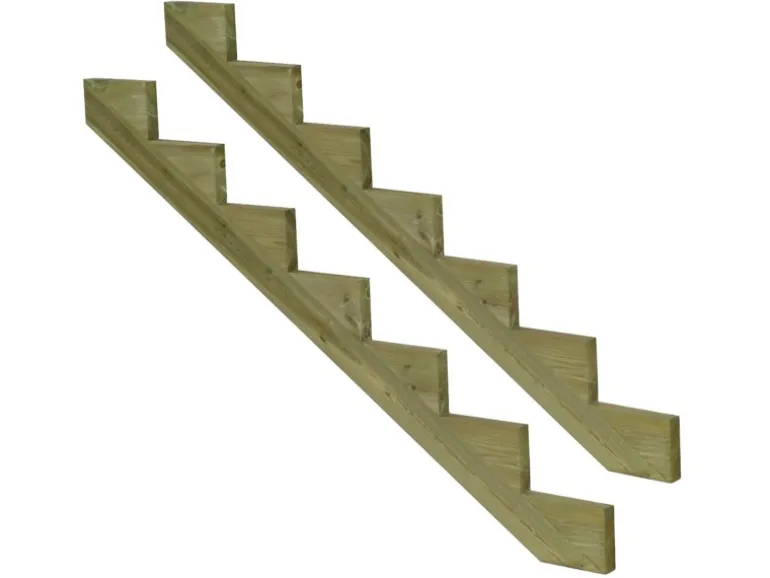 Dann verwenden Sie unsere praktischen Treppenwangen aus imprägniertem Holz (KDI)! Unsere Treppenwangen sind mit 2, 3, 4, 5, 6, 7 oder 8 Stufen erhältlich und die benötigte Anzahl hängt von der Breite Ihrer Treppe ab. Legen Sie die Treppenwangen im Abstand von max. 60 cm hin und schrauben Sie die Holzstufenbretter darauf. Für zusätzliche Stabilität und Sicherheit können Sie auch eine Setzstufe hinter jeder Stufe anbringen, indem Sie ein Holzbrett vertikal gegen die Treppenwange schrauben. Für die Treppenstufen empfehlen wir unsere KDI Terrassenbretten.