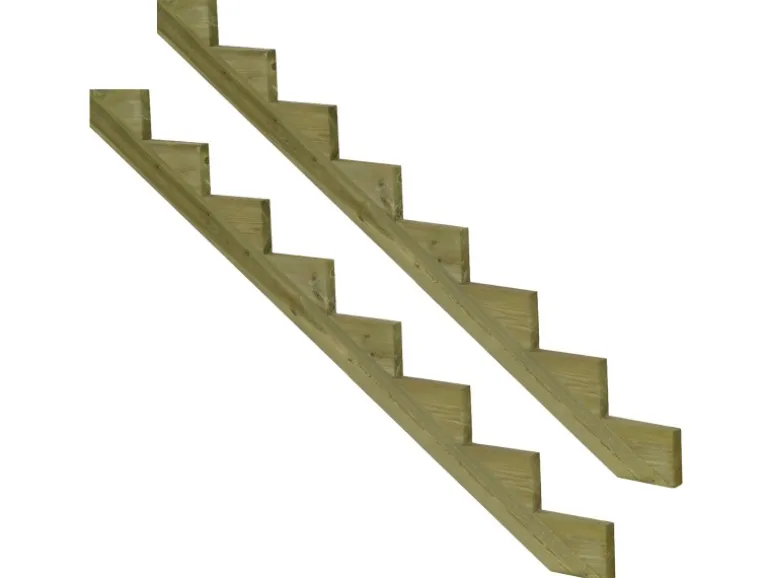 Dann verwenden Sie unsere praktischen Treppenwangen aus imprägniertem Holz (KDI)! Unsere Treppenwangen sind mit 2, 3, 4, 5, 6, 7 oder 8 Stufen erhältlich und die benötigte Anzahl hängt von der Breite Ihrer Treppe ab. Legen Sie die Treppenwangen im Abstand von max. 60 cm hin und schrauben Sie die Holzstufenbretter darauf. Für zusätzliche Stabilität und Sicherheit können Sie auch eine Setzstufe hinter jeder Stufe anbringen, indem Sie ein Holzbrett vertikal gegen die Treppenwange schrauben. Für die Treppenstufen empfehlen wir unsere KDI Terrassenbretten.