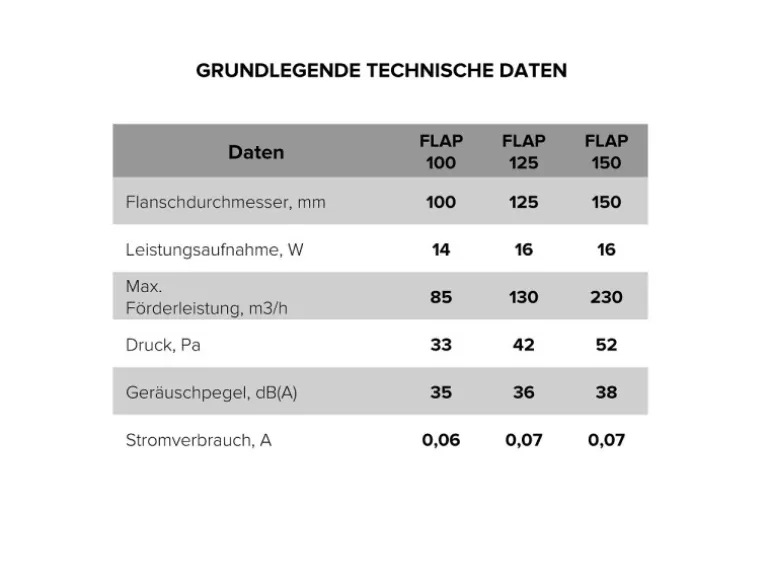 Technische Daten: 220 – 240 V / 50 Hz, Ø125 mm, 16 W, 130 m³/h, 36 dB(A)/3m, IP24, maximaler Druck – 42 Pa, Überhitzungsschutz. In Räumen mit bis zu +40°C Umgebungstemperatur verwendbar.