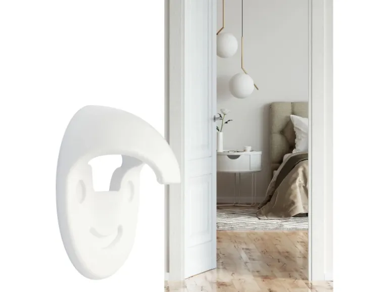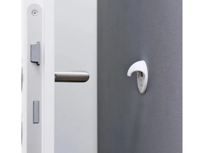 Der Wandtürstopper/Türfeststeller ist aus hochwertigem Kunststoff gefertigt. Der EH 5085 punktet mit einem einmaligen Doppelnutzen: Der neuartige Wandtürstopper dient als wirksamer Prallschutz und fungiert zudem als sicherer Türfeststeller. Bei leichten Türstößen federt er die Tür sanft ab. Zum Fixieren der Tür sowie bei harten Türschlägen nimmt eine integrierte Haltefunktion die Klinke auf und hält die Tür zuverlässig fest. Durch Herunterdrücken der Türklinke lässt sich die Verbindung schnell und einfach wieder lösen.