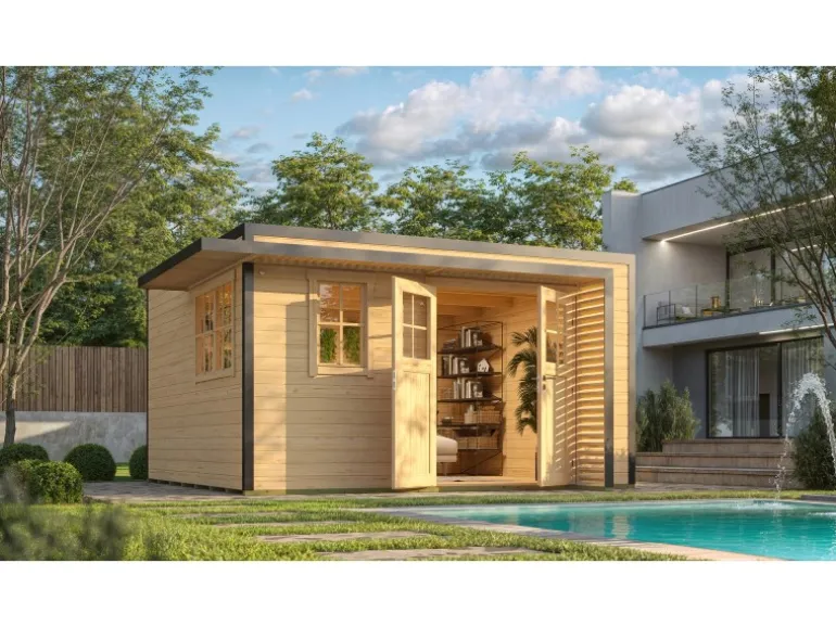 Die Variante mit den Maßen 400 cm × 400 cm und einer Wandstärke von 44 mm ermöglicht durch die Doppeltür ein einfaches und schnelles Verstauen der Geräte. Durch die vielen Fenster sowie die Doppeltür mit integriertem Fenster fällt viel Tageslicht ein, was das Arbeiten im Gartenhaus angenehm macht.