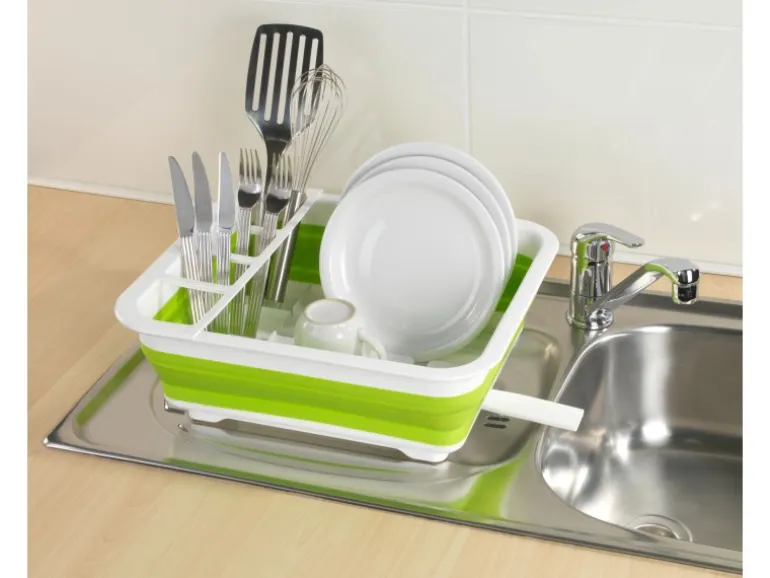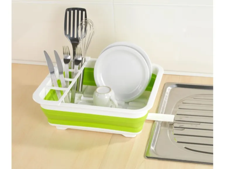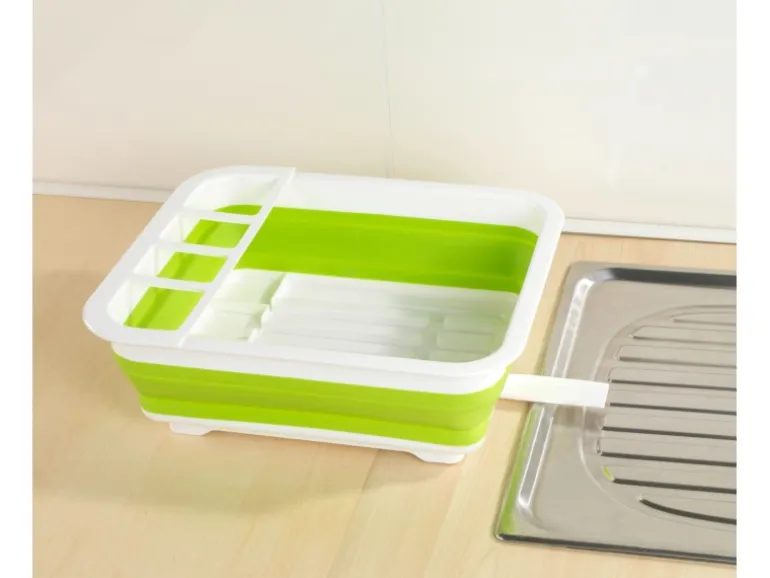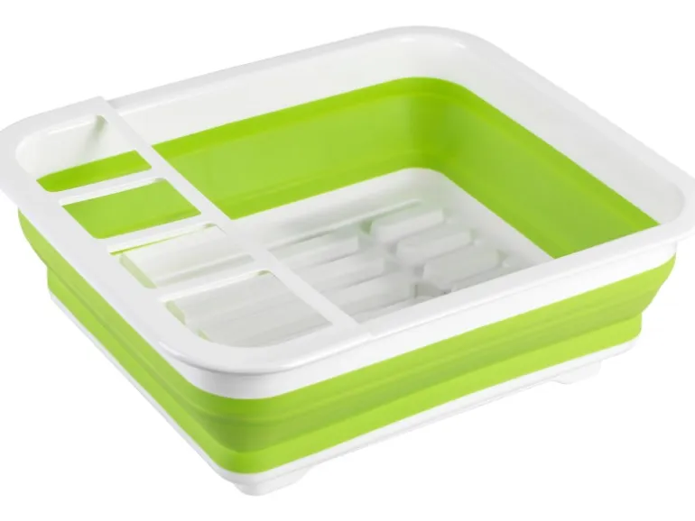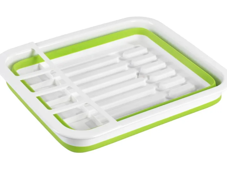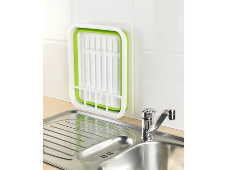 Das handliche Abtropfgestell ist im modernen Grün-Weiß gehalten und lässt sich bei Nichtgebrauch platzsparend zusammenfalten.