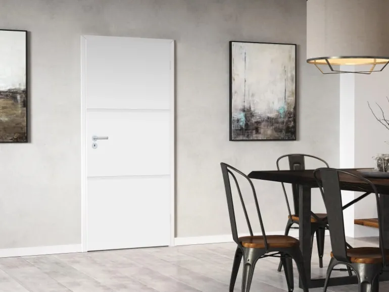 Die Zimmertür Portofino ist eine klassisch-moderne Weißlacktür, ähnlich RAL 9016. In Kombination mit der weißen Zarge passt die Portofino Tür zu jedem Wohnstil. Die zeitlose Optik und die moderne Linienführung sorgen in Ihren Räumen für klassische Eleganz. Die mehrschichtige Lackoberfläche wirkt edel und elegant und ist durch den wasserverdünnbaren Schichtlack besonders langlebig.